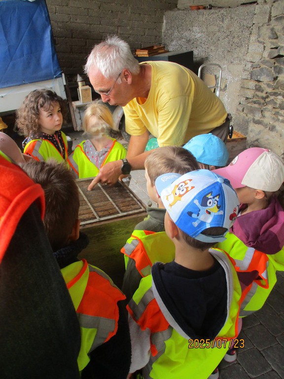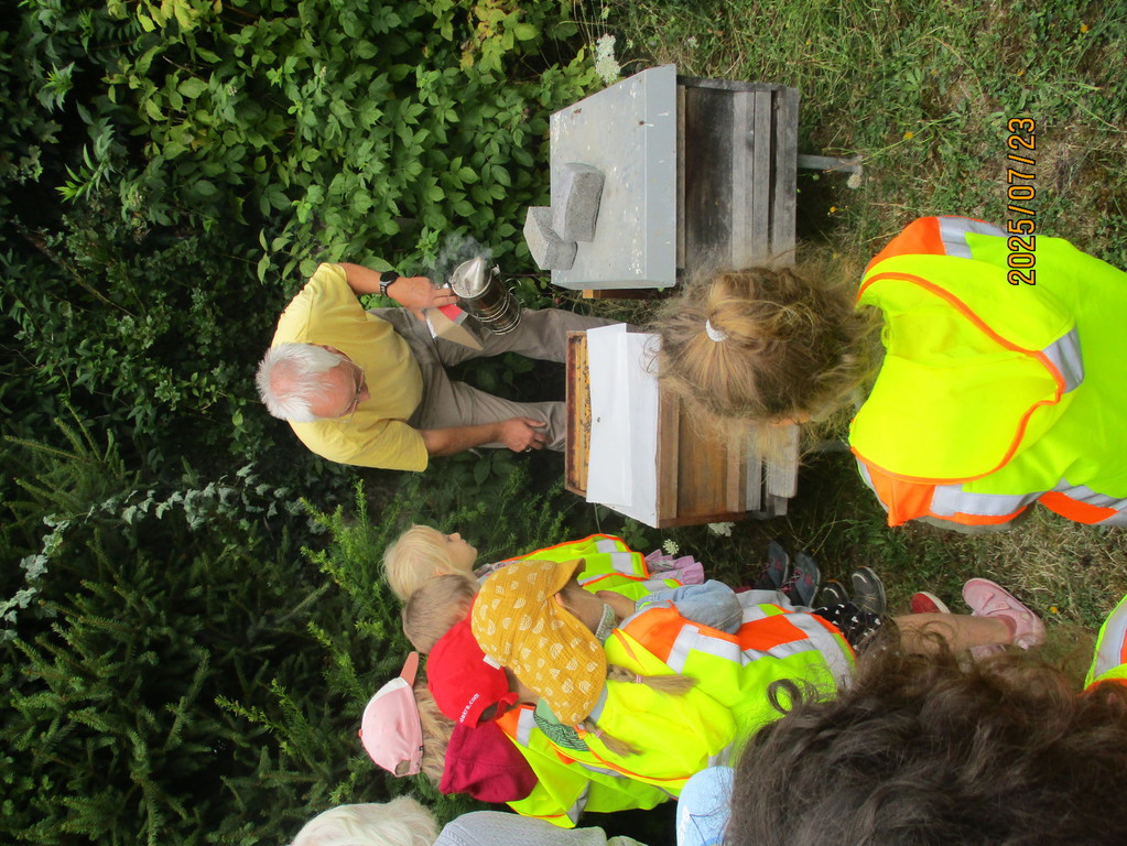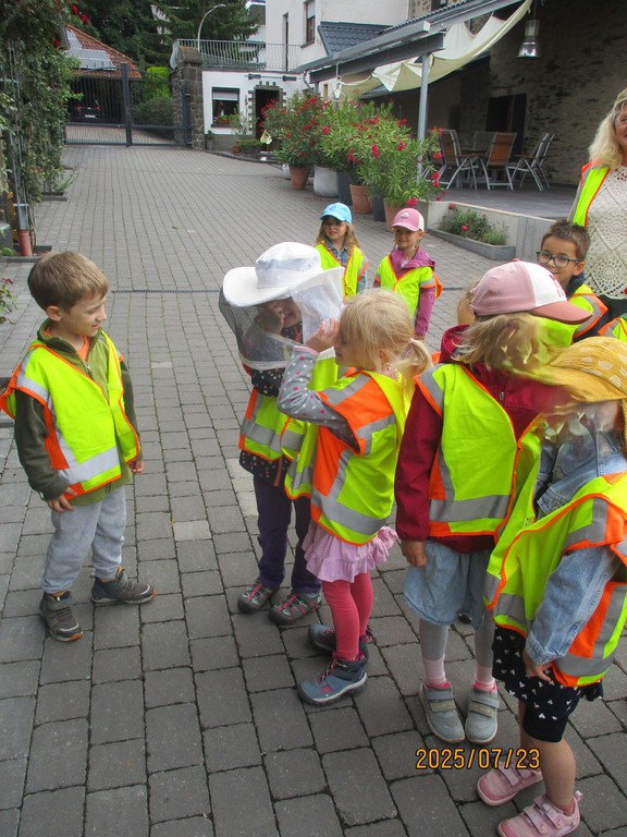In der Kindertagesstätte Schwalbennest haben wir Bienenhotels bei denen die Kinder ganz genau beobachten können, wie die Wildbienen sich verhalten. In den Gesprächen kamen viele Fragen rund um das Thema Bienen auf. Es freute uns sehr, als Herr Einig uns vor den Sommerferien ermöglichte ein Bienenvolk und vieles mehr bei ihm im Bienengarten in Polch, zu besichtigen. Gespannt und mit zahlreichen Fragen machten wir uns auf Weg dorthin. Begleitet wurden wir von unserer Nabu Naturbotschafterin Frau Klöckner, die regelmäßig in die Kita kommt und solche Interessen der Kinder aufgreift. Zuerst zeigte und erklärte uns Herr Einig die Schutzkleidung eines Imkers und der Schleier durfte anprobiert werden. Dann konnten wir sehen wie das Bienenwachs gereinigt und gewonnen wird. Darauf konnten wir eine Beute (Unterkunft der Bienen) ohne Bienen ganz genau betrachten und anfassen. Herr Einig hat ein ganz ruhiges Bienenvolk und nachdem er in einem Smoker Feuer gemacht hat (das beruhigt die Bienen) konnten wir dieses ganz aus der Nähe und dieses Mal mit Bienen sehen. Fasziniert schauten wir uns die Waben, Wände, den Honig und die vielen Bienen ganz genau an. Es war so interessant, dass sogar ängstliche Kinder näherkamen oder sich mit einer Erzieherin nach vorne getraut haben. Zum Anschluss bekamen alle ein Probiergläschen mit Honig für zu Hause und noch eins für die anderen Kinder in der Kita. Zum Probieren möchten wir demnächst in der Kita ein Brot backen und mit dem Honig im Frühstücksraum anbieten.