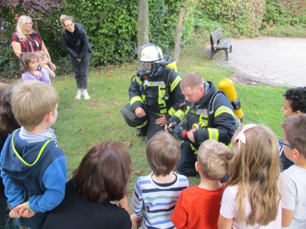 ,Schon während die Kinder noch nach draußen zu den jeweiligen Treffpunkten strömten traf die Feuerwehr mit Sirene und Blaulicht mit mehreren Fahrzeugen ein. Nun begann der Übungsteil für die Feuerwehrleute, bei dem die Kinder gespannt zuschauten.