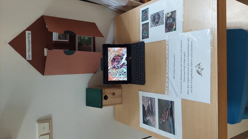 In unserem Nistkasten mit Kamera sind Spatzen (Haussperlinge) eingezogen. Über unser Tablet können die Kinder nun täglich live verfolgen, wie die Spatzeneltern ihre 4 Spatzenbabys füttern und großziehen.