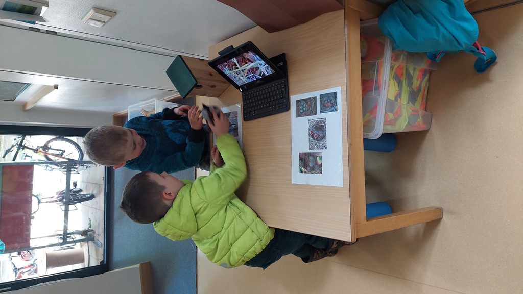 Im Flur haben wir nun vor dem Büro einen Tisch eingerichtet zum Thema Spatz, auf dem den Kindern das Tablet zur Beobachtung zur Verfügung steht. Außerdem finden sie dort auch Fotos von Haussperlingen, um zwischen männlichem und weiblichem Vogel unterscheiden zu lernen.
