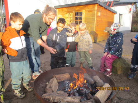 Schließlich stießen sogar die jüngsten Kinder unserer Kita dazu, und auch diese hatten die Möglichkeit, die Wärme des Feuers zu spüren, Holzscheite in die Flammen zu legen und ihr eigenes Popcorn zuzubereiten. Für einige Kinder war es besonders interessant, sich auf die Suche nach Naturmaterialien zu machen und diese in das Feuer zu befördern. Staunend verfolgten sie, wie einzelne trockene Blätter sofort in Flammen aufgingen, während feuchte Ästchen nur langsam zu kokeln begannen.